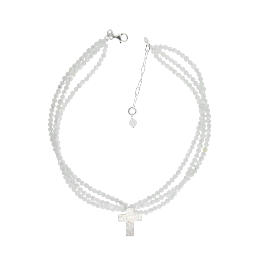 El collar aire es una pieza sutil y delicada que evoca la pureza y la ligereza con su diseño de doble vuelta en madre perla y plata .925. Su collar de cruz minimalista añade un toque espiritual y sofisticado, ideal para quienes buscan un accesorio discreto, elegante y con significado.