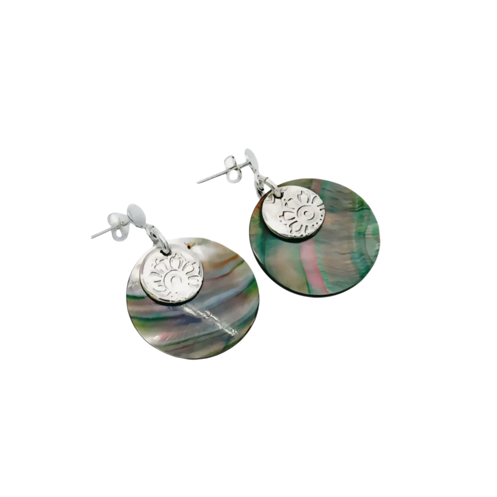 Diseño: Aretes con colgante circular de madre perla y detalle en plata