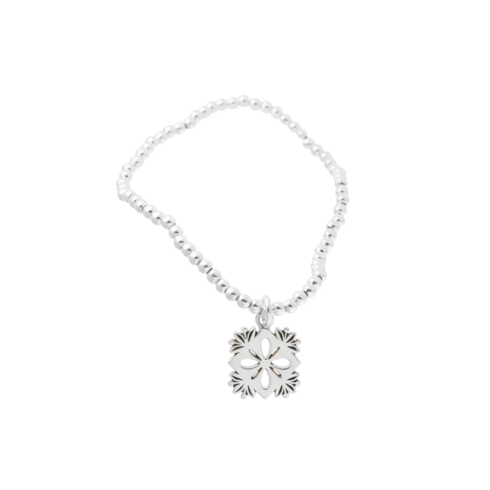 La pulsera chic flor abundancia, elaborada en plata .925, es una pieza sofisticada que simboliza la prosperidad y la buena fortuna. Su diseño de esferas pulidas crea un brillo sutil que realza la belleza del collar en forma de flor calada, un símbolo de crecimiento y plenitud.
