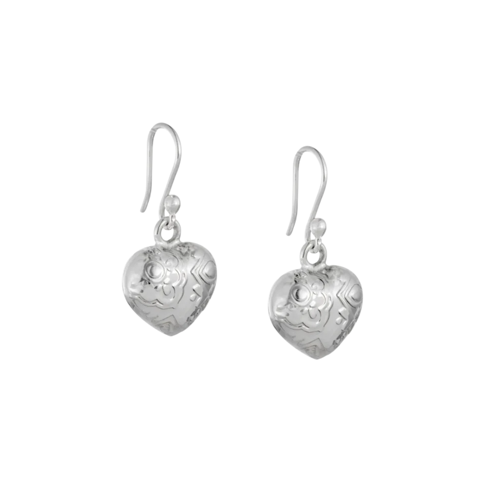 Diseño: Aretes colgantes con corazones bombeados y grabado tapizado