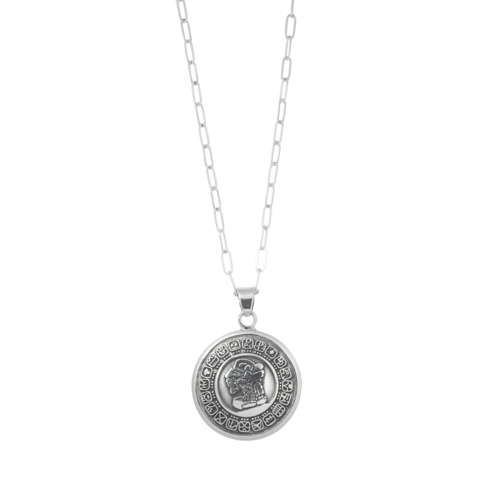 Su estructura de círculo bombeado aporta volumen y una sensación tridimensional que realza los detalles grabados en ambas caras. Acompañado de una cadena de 50 cm, este collar es una joya llena de historia y significado, perfecta para quienes buscan una conexión profunda con sus raíces y cultura.