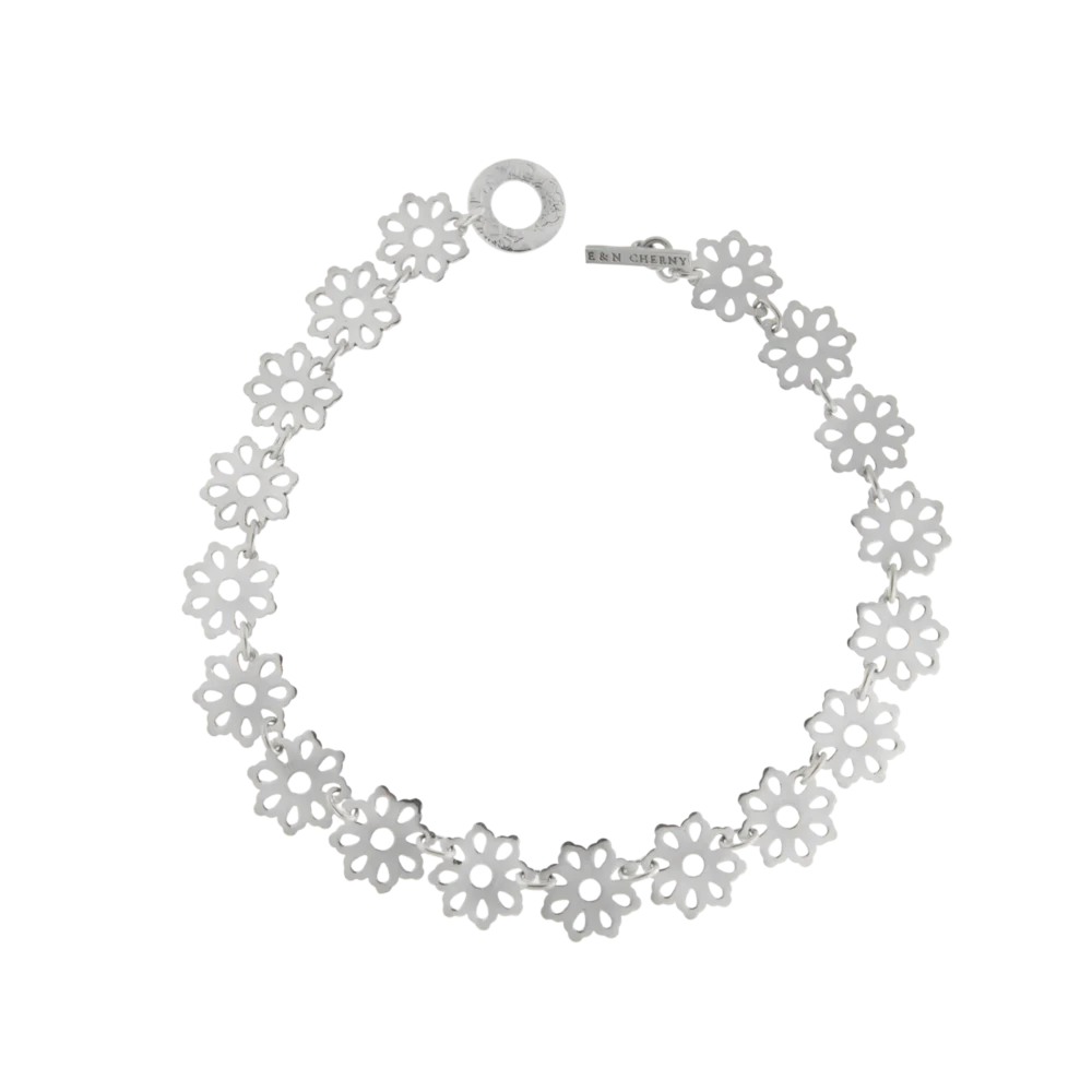Etiquetas: Acabado Brillante, Cierre Redondo, Diseño Simétrico, Eslabones Florales, Estilo Femenino, Flores Caladas, Plata Pulida, Pulsera