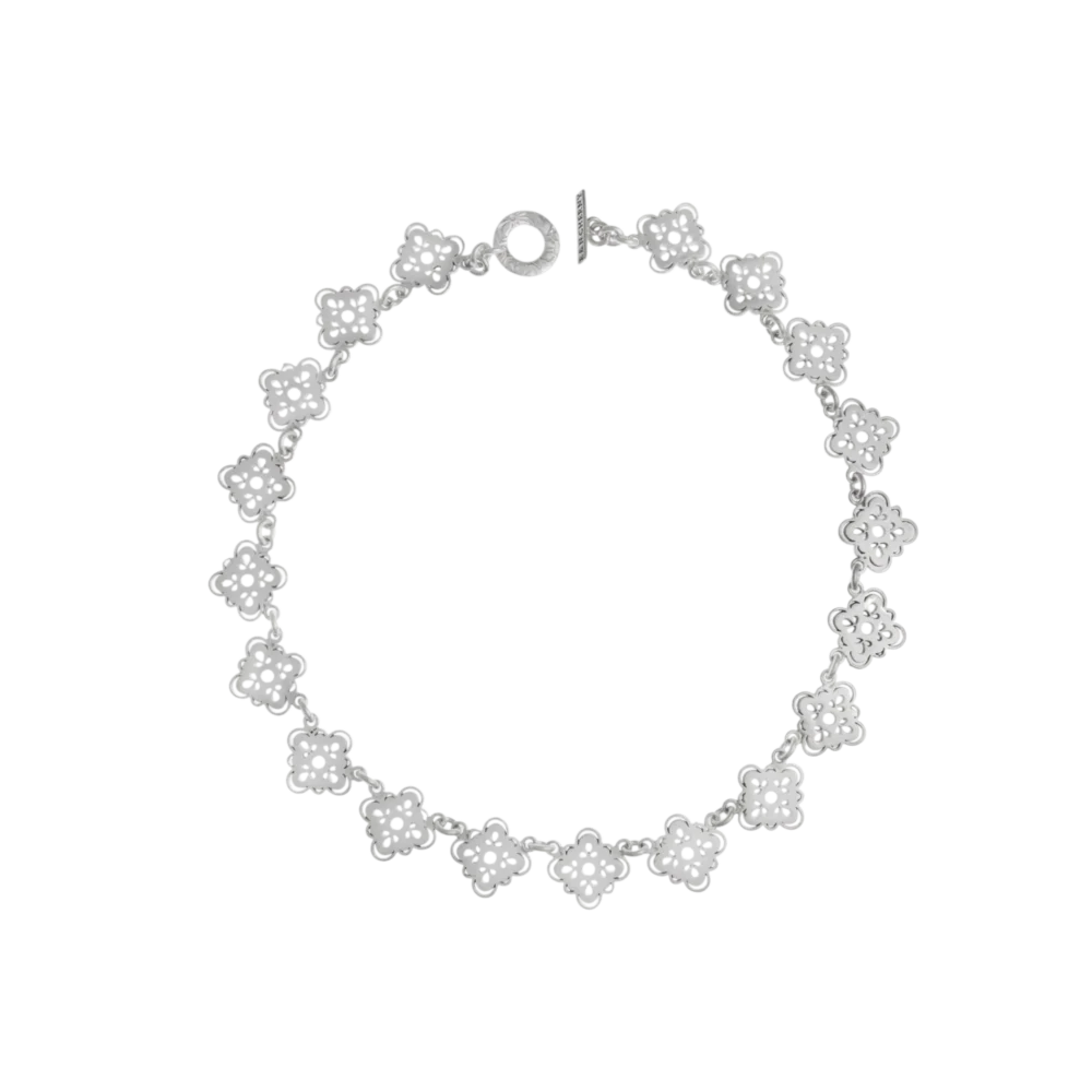 Etiquetas: Artesanal, Cierre De Barra, Collar, Diseño Floral, Elegante, Eslabones, Estilo Vintage, Plata Pulida, Simétrico, Trébol Calado