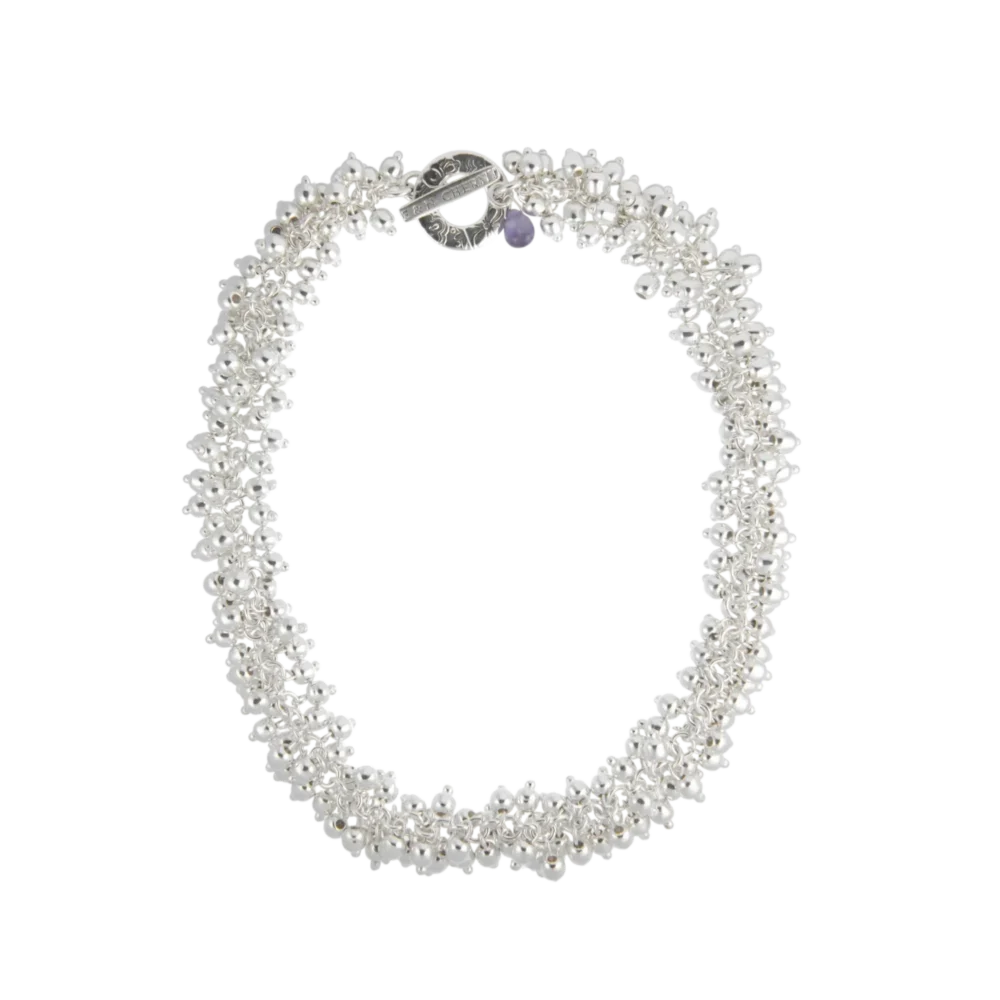 Etiquetas: Acabado Brillante, Amuleto Amatista, Bolitas Entretejidas, Cierre Tipo T-Bar, Collar Voluminoso, Diseño Tejido, Esferas Pequeñas, Textura Densa