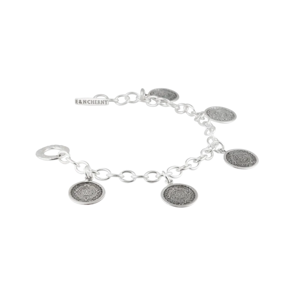 La pulsera monedas Azteca rinde homenaje a la riqueza cultural de la antigua civilización azteca. Con cinco colgantes de monedas finamente detalladas, esta pieza evoca el esplendor del pasado con un toque de sofisticación.