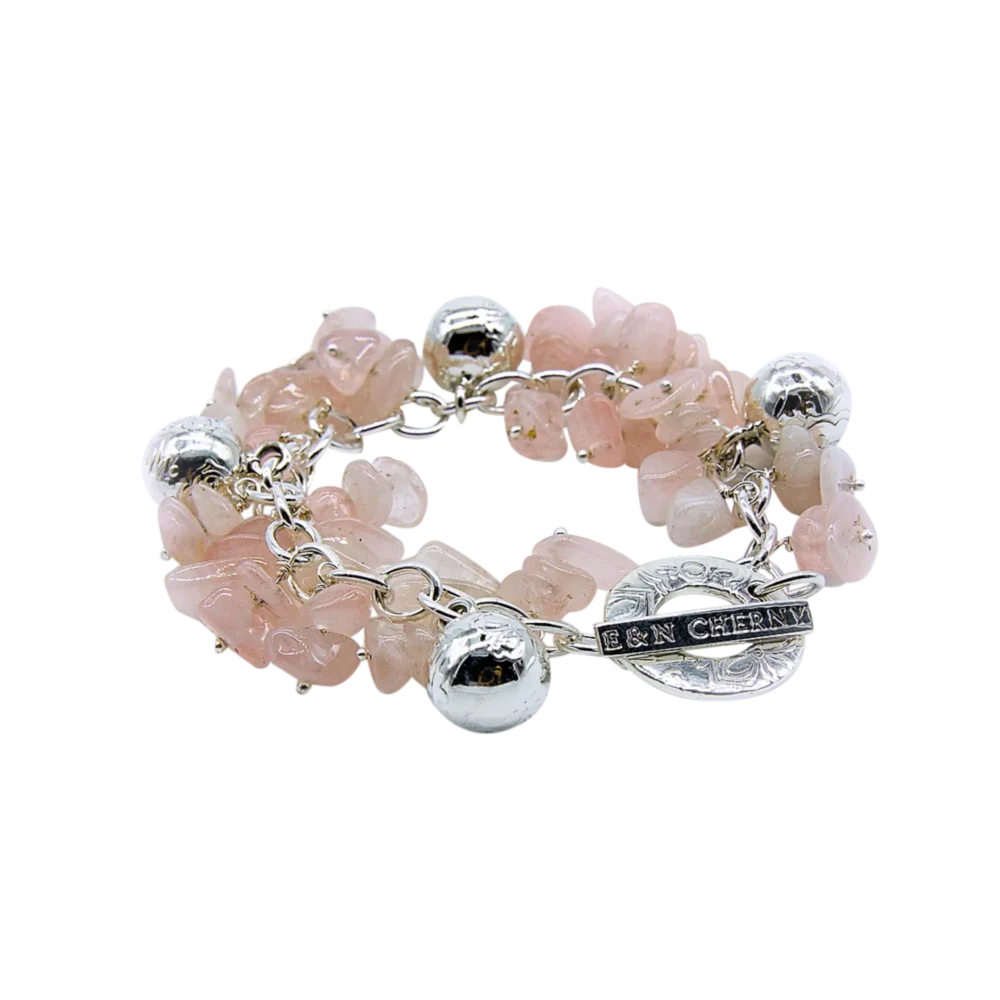 Los fragmentos irregulares de cuarzo rosa le otorgan un aspecto natural y orgánico, mientras que los detalles en plata añaden un toque de sofisticación. Su diseño en cadena permite un ajuste cómodo, ideal para llevar consigo la energía positiva y armonizadora de esta piedra.